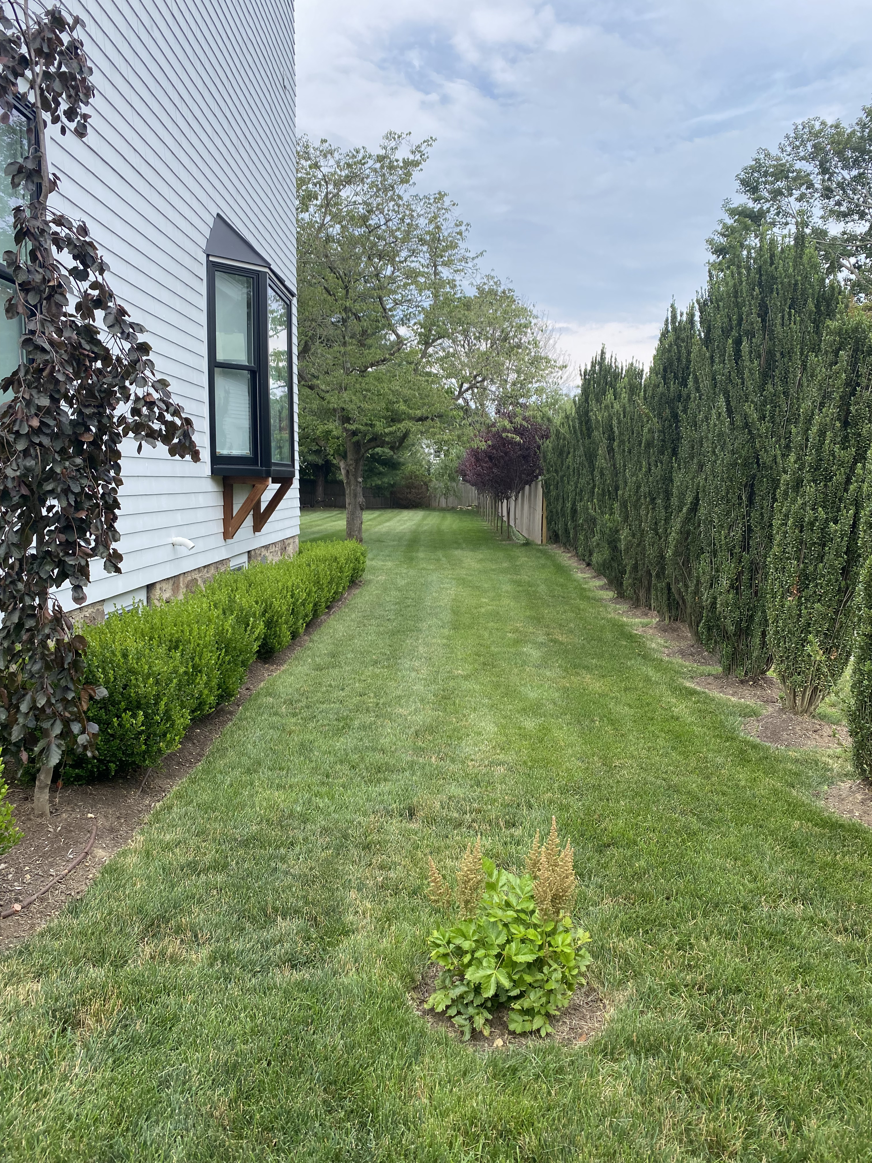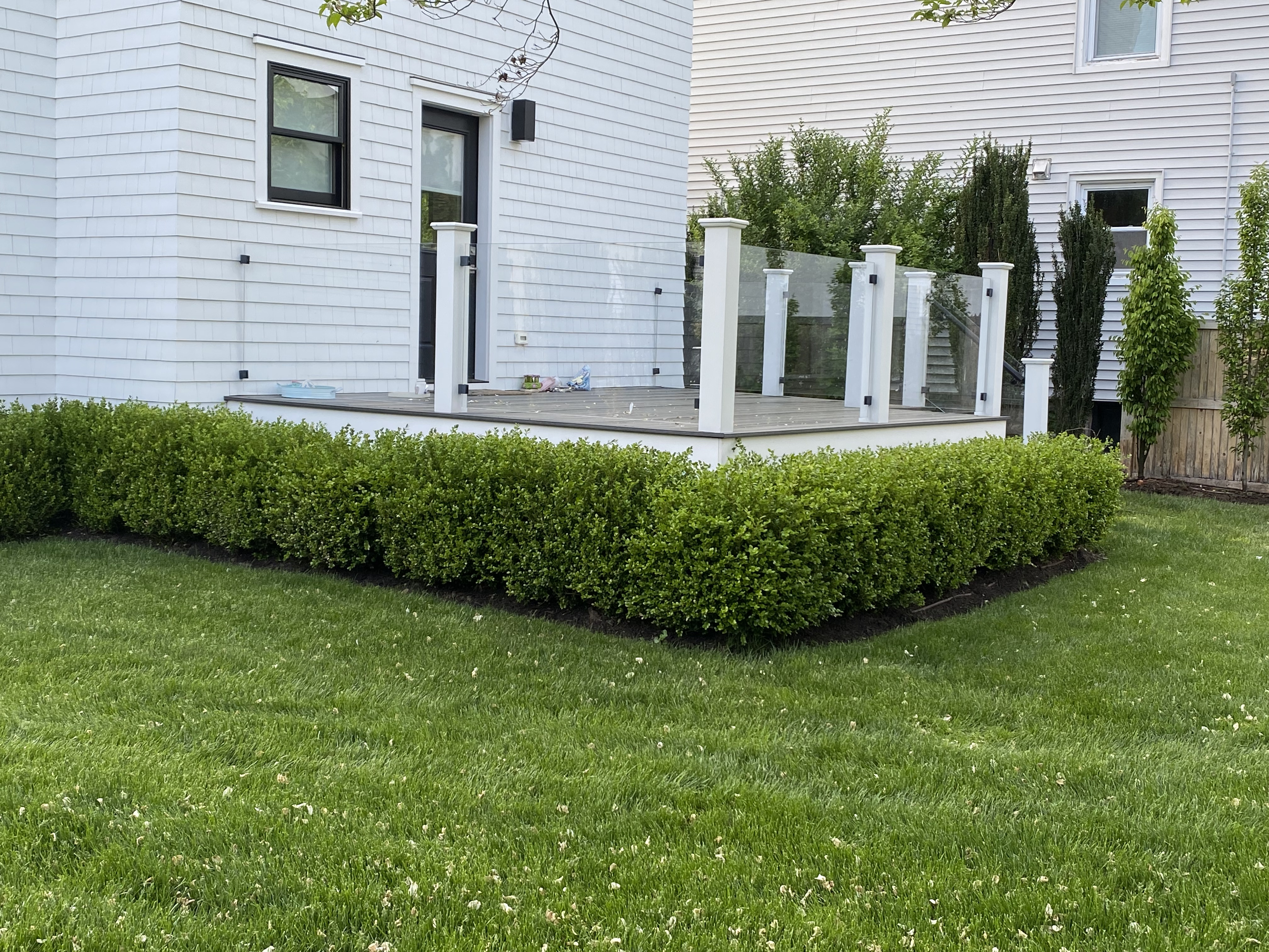 We installed a lush green hedge along the house to conceal the underside of the deck and create a natural, cohesive backdrop. A new lawn was added to refresh the space and provide a healthy, vibrant foundation for the landscape. Planting selections and placement were designed to enhance visual balance while maintaining a clean, low-maintenance layout that complements the home.