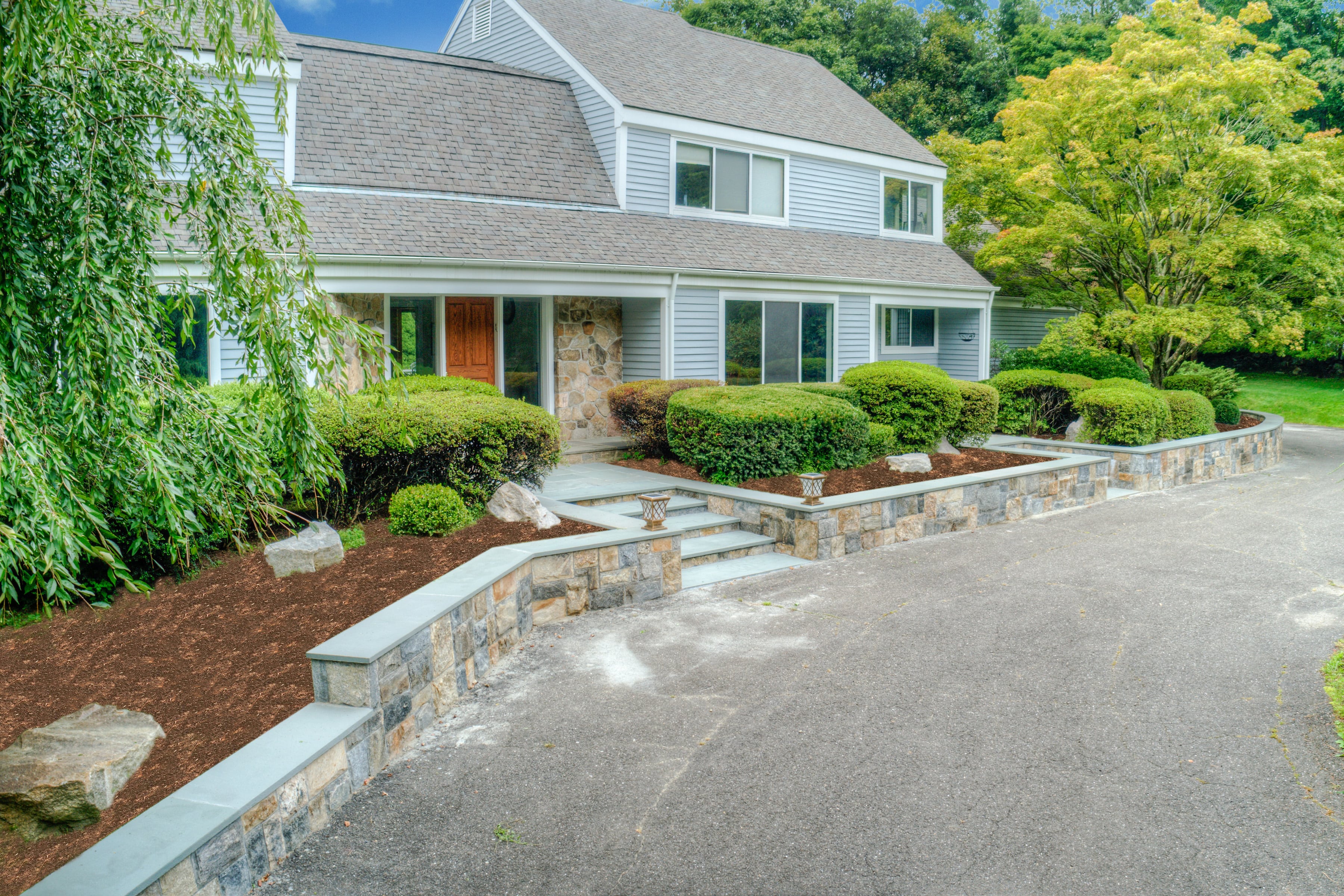 The new retaining wall dramatically enhanced the curb appeal of the front entrance and contributed to a noticeable increase in the estate’s overall value. The finished result is a timeless, understated feature that strengthens the home’s presence, makes a strong first impression, and aligns seamlessly with the homeowner’s aesthetic goals.